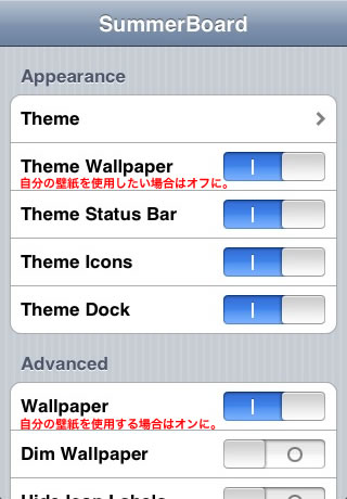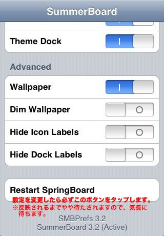 各設定を変更した場合は、最後に必ず「Restart SpringBoard」ボタンをタップして、ホーム画面を再起動させることをお忘れなく。。。笑